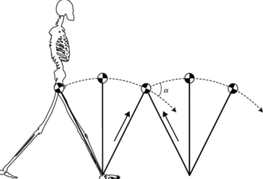 Figure 1: The maintenance of stability in the human gait cycle following the dynamics of an inverted pendulum. The trailing and leading leg redirect the trajectory of the centre of mass from a downwards arc to an upwards arc in preparation of the next step. The energetic cost of this redirection is proportional to α. Image from Matthis and Fajen (2013).